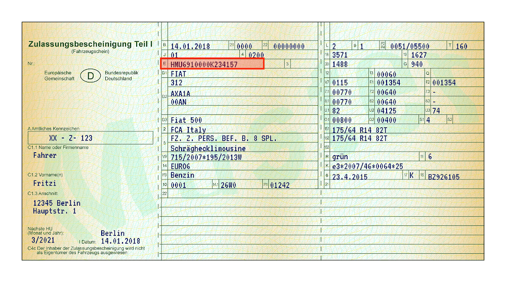 Die Fahrzeugidentifikationsnummer steht in der Zulassungsbescheinigung Teil 1 (Fahrzeugschein) und im Teil 2 (Fahrzeugbrief) jeweils im Feld E.